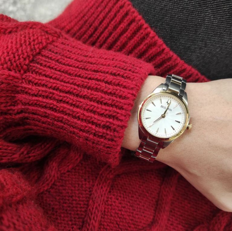 Two-tone stainless steel case and bracelet with a silver white dial featuring gold-tone hands and markers. Domed mineral crystal. Short fold over buckle closure.