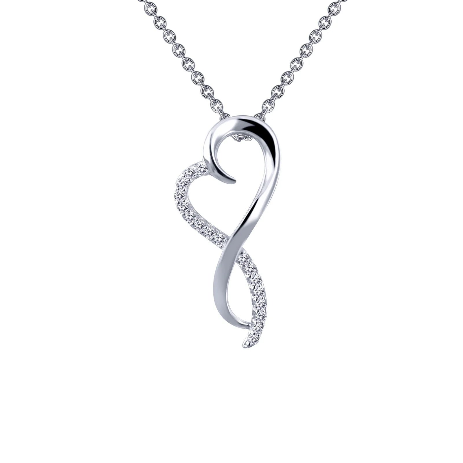 Elegant and stylish. This infinity heart pendant is set with Lafonn's signature Lassaire simulated diamonds in sterling silver bonded with platinum. The pendant comes on an adjustable 18" chain.