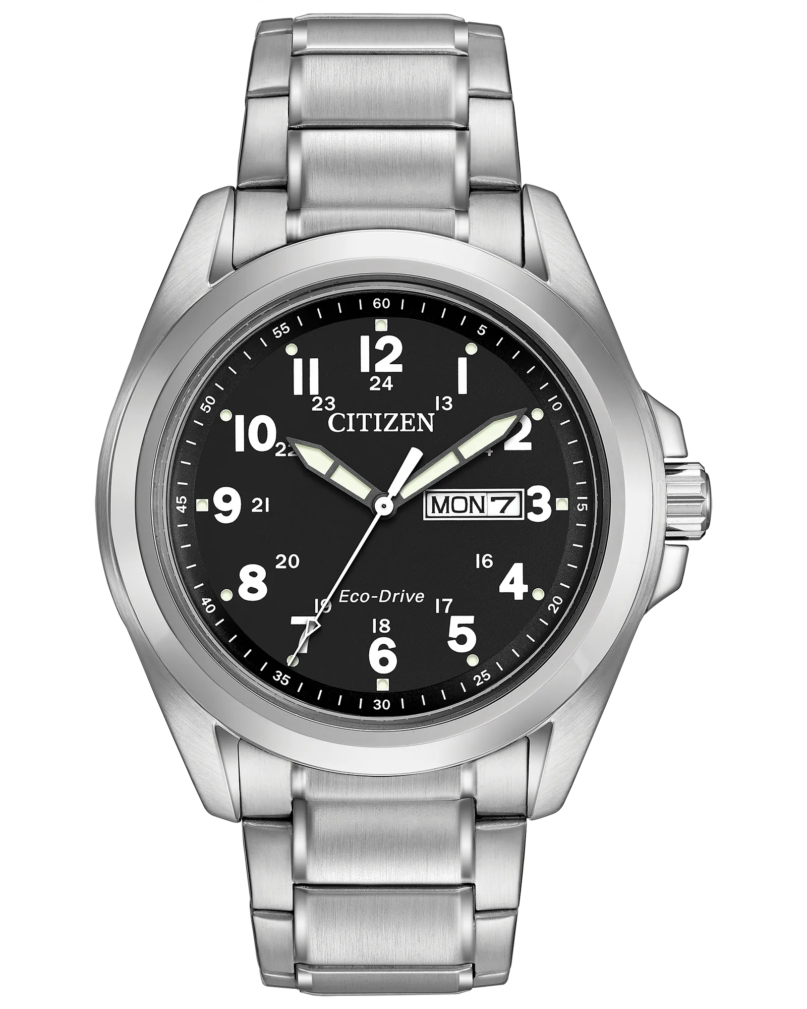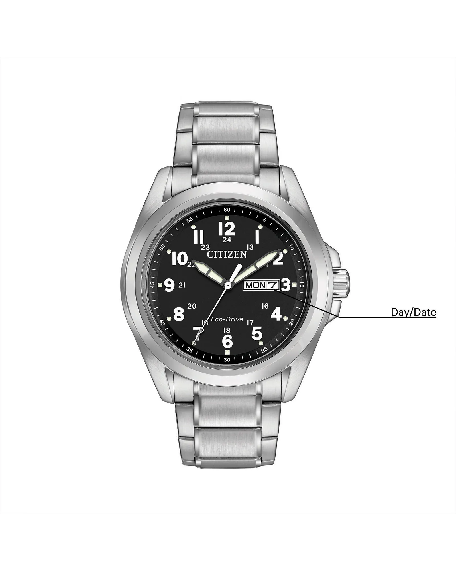 Classic watch styling designed for the man of today. Sporty with clean lines and oversized Arabic numbers, just what we want in an everyday timepiece. Featuring day and date. Featuring our Eco-Drive technology – powered by light, any light. Never needs a battery. Caliber number J800.