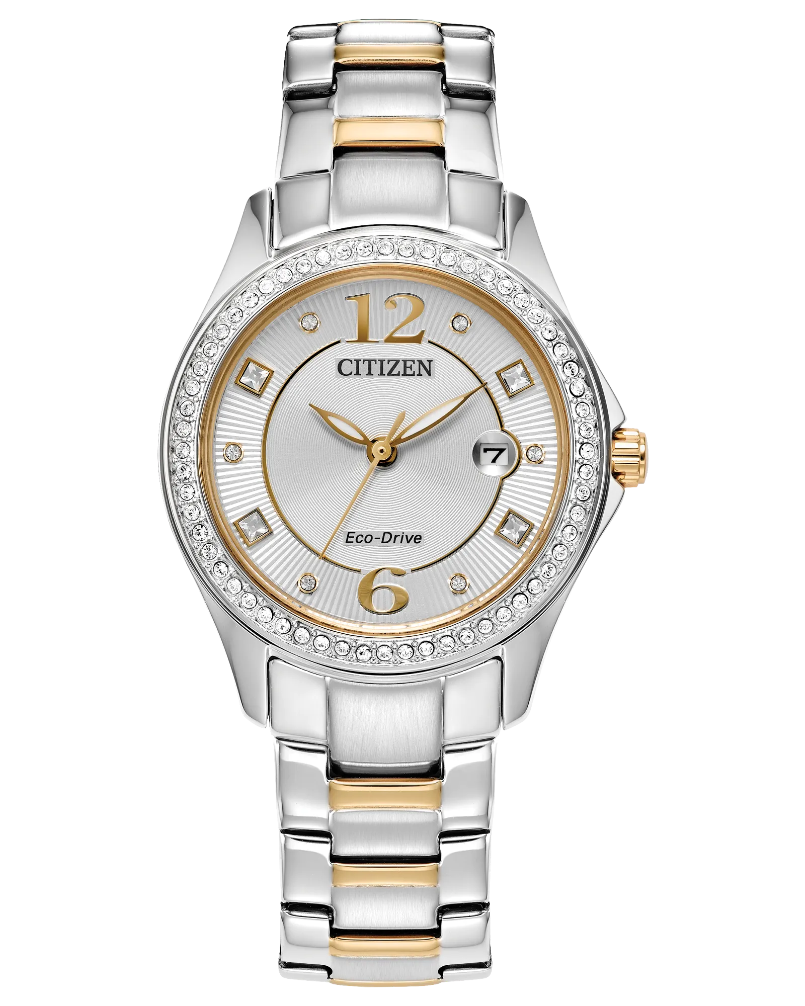 A shimmering statement is made with the newest addition to the Crystal collection. This elegant timepiece shines bright with 70 crystals surrounding the two-tone stainless steel case and white 3-hand dial and has a silver- and gold-tone stainless steel bracelet fastened with a fold over clasp. Featuring our Eco-Drive technology that’s sustainably powered by any light and never needs a battery, this fashionable watch will add sparkle to your day-to-evening look and a modern elegance to your wrist.