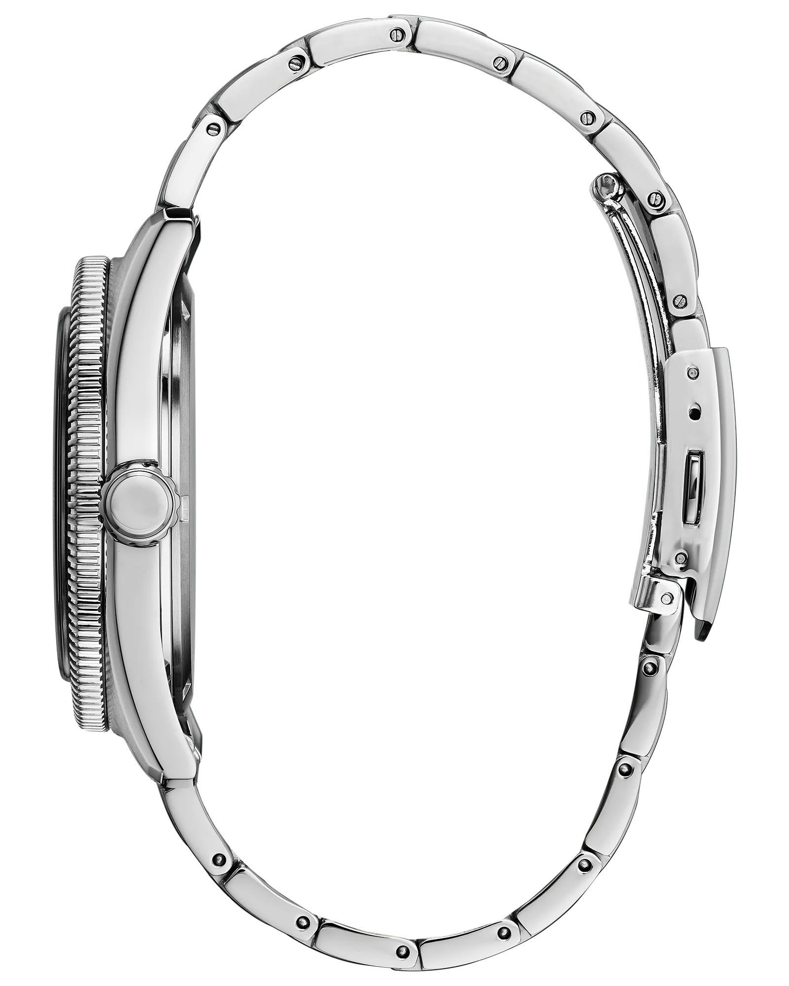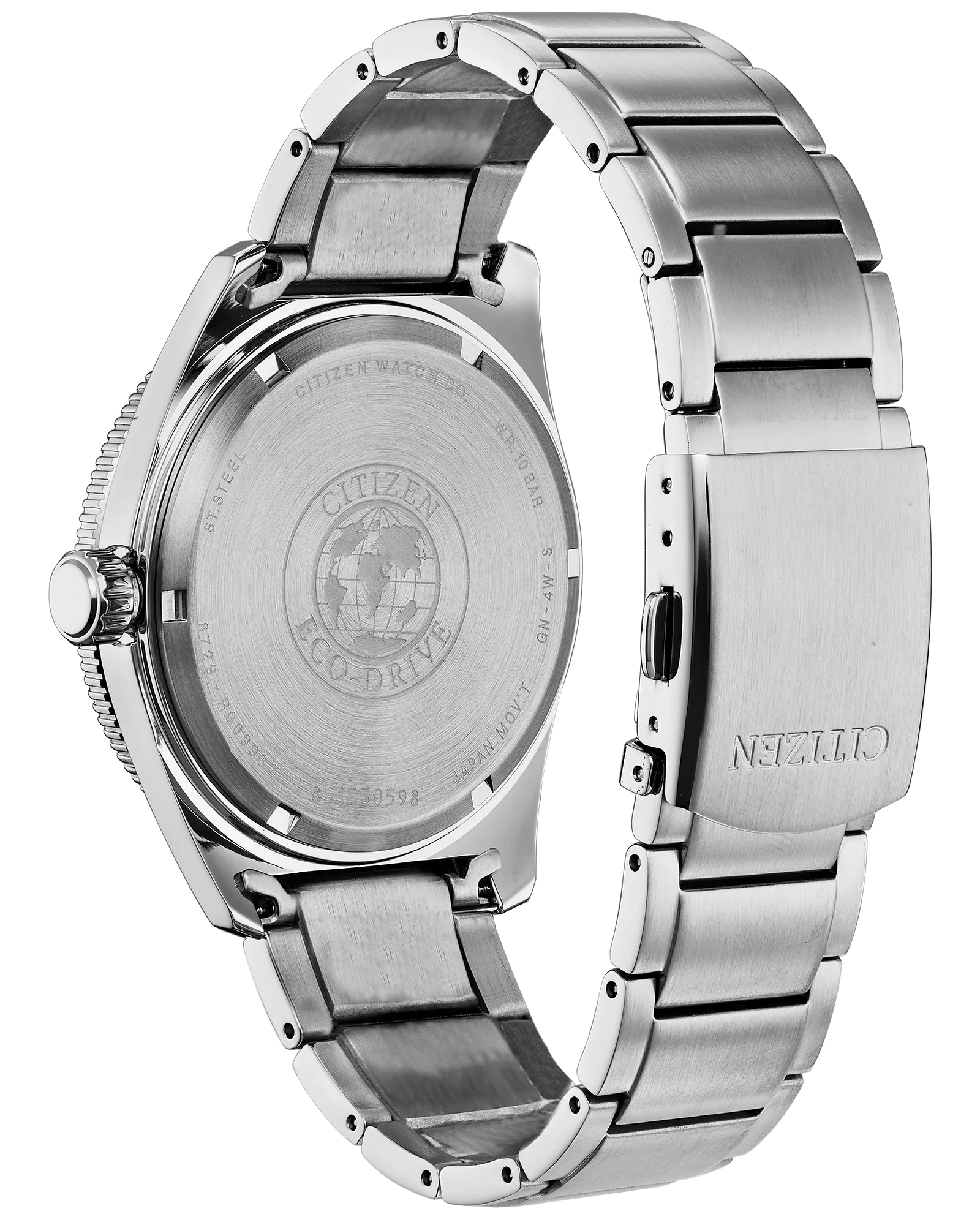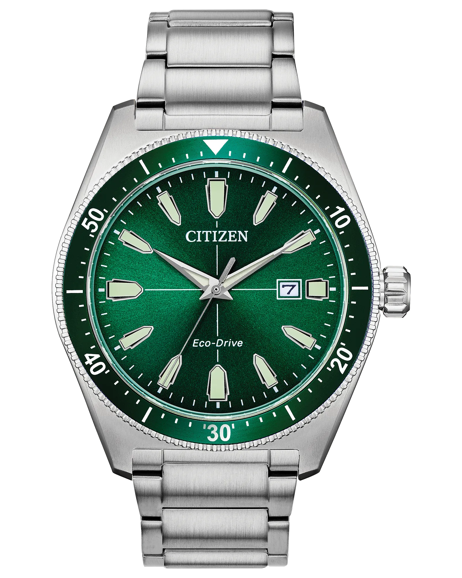 Nothing says classic better than a vintage throwback, and the redesigned Citizen Vintage Brycen Sport timepiece is just that, with distinguished features sure to stand out on your wrist. This stylish watch in a stainless steel case with pine green dial and bezel, stainless steel bracelet and date. Featuring our Eco-Drive technology – powered by light, any light. Never needs a battery. Caliber number J810.