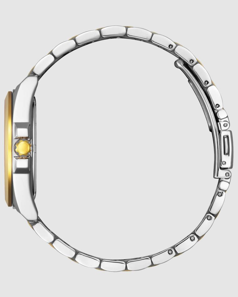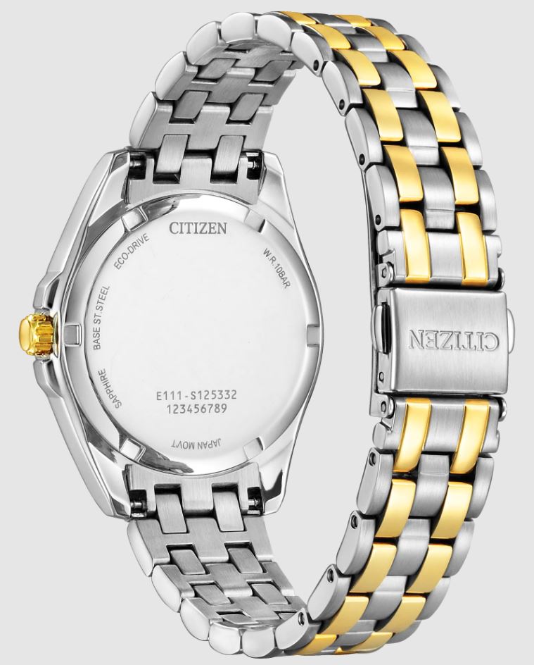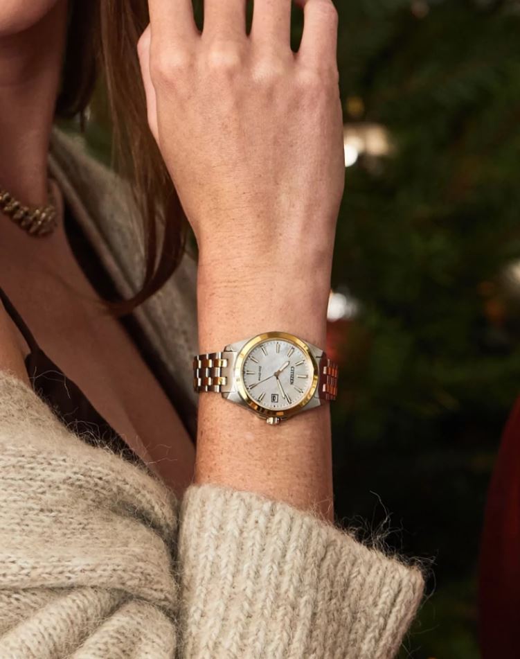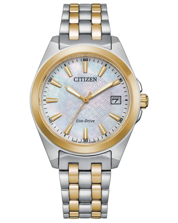 This classic timepiece from Citizen is a popular women’s watch that will never go out of style. It features a two-tone stainless steel bracelet-style watch band, paired with a mother-of-pearl three-hand dial to make a watch that will look great for any occasion. In addition to showing the current date, the watch is sustainably powered by light with the exclusive Citizen Eco-Drive technology, so you’ll never have to worry about missing time. For every woman searching for an every-day timepiece, this watch is the perfect accessory to add to the wardrobe.