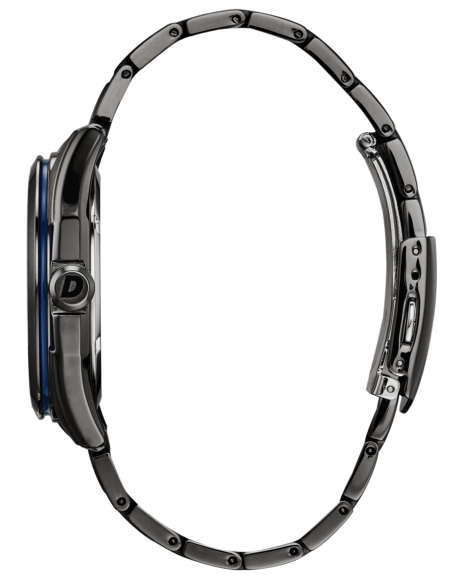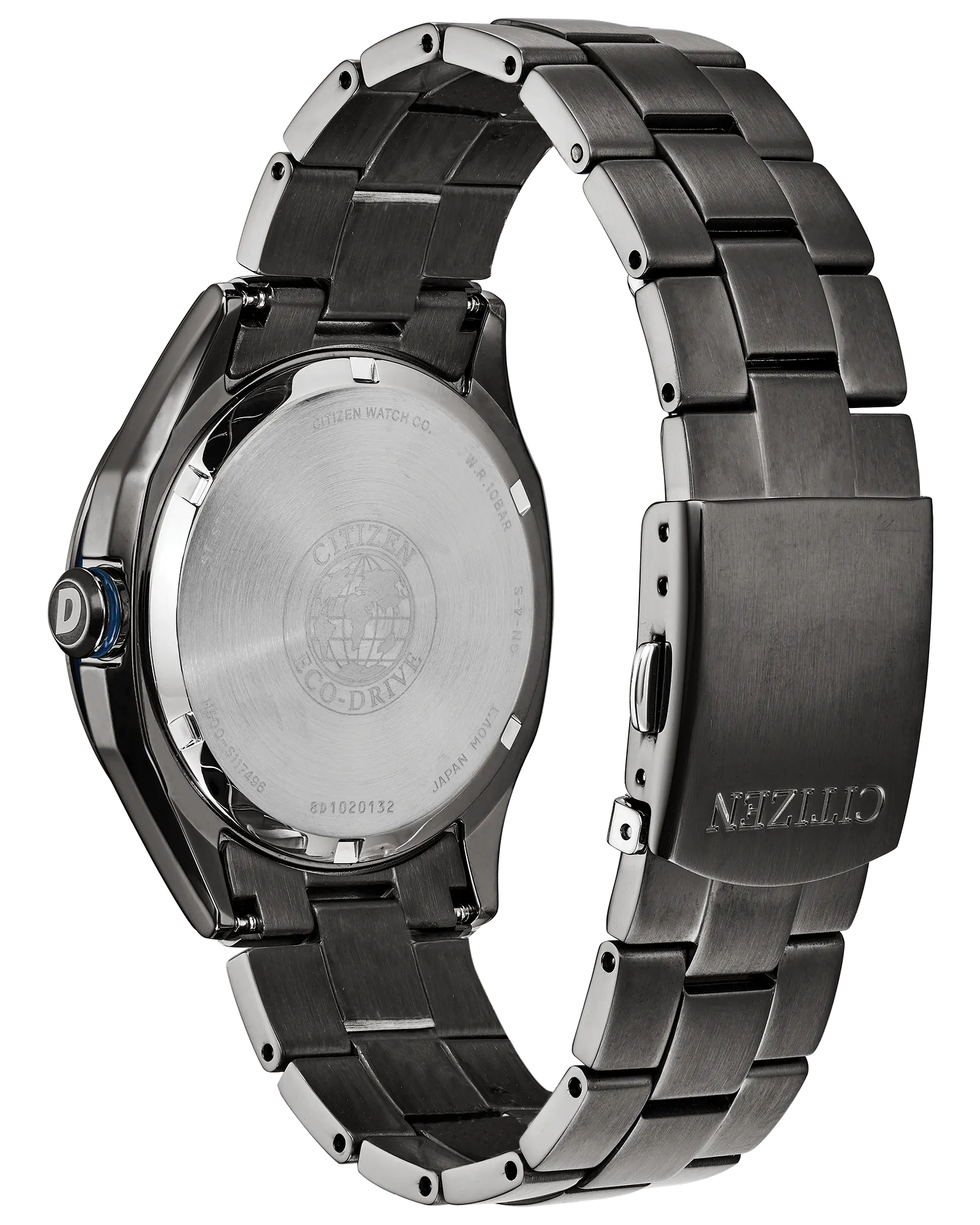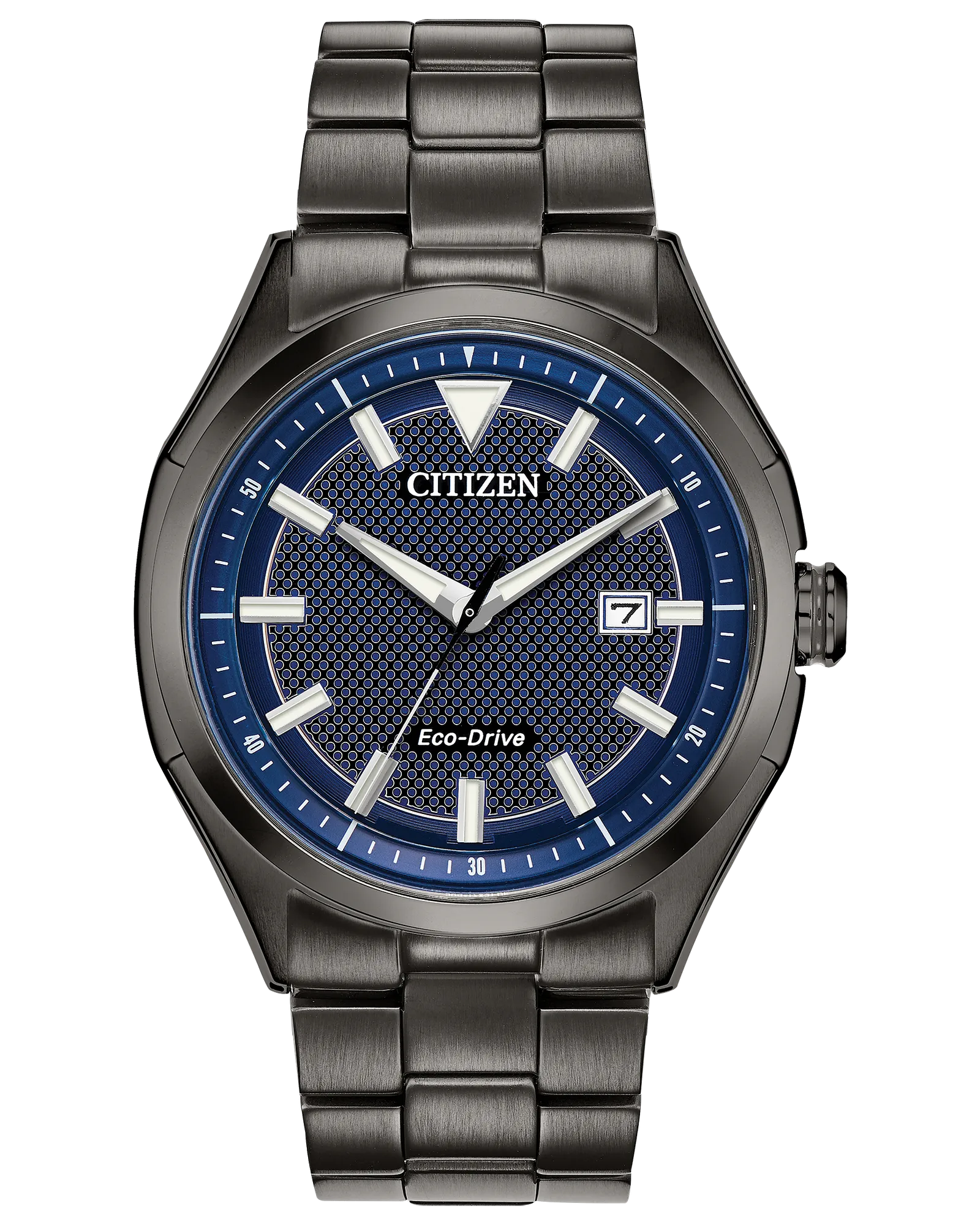 An edgy structure in a classic setting, this Drive from Citizen WDR watch features a deep gray ion-plated stainless steel case and bracelet with a denim blue dial and date. Featuring our Eco-Drive technology – powered by light, any light. Never needs a battery. Caliber number J810.