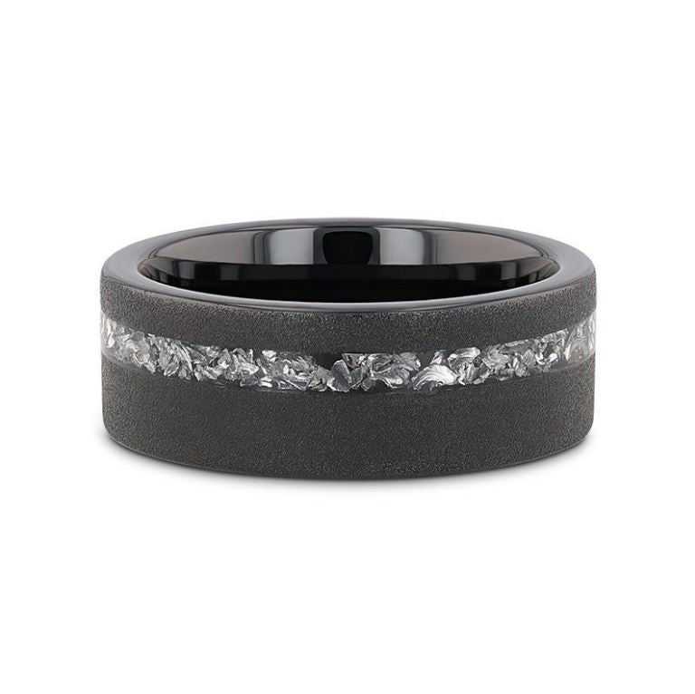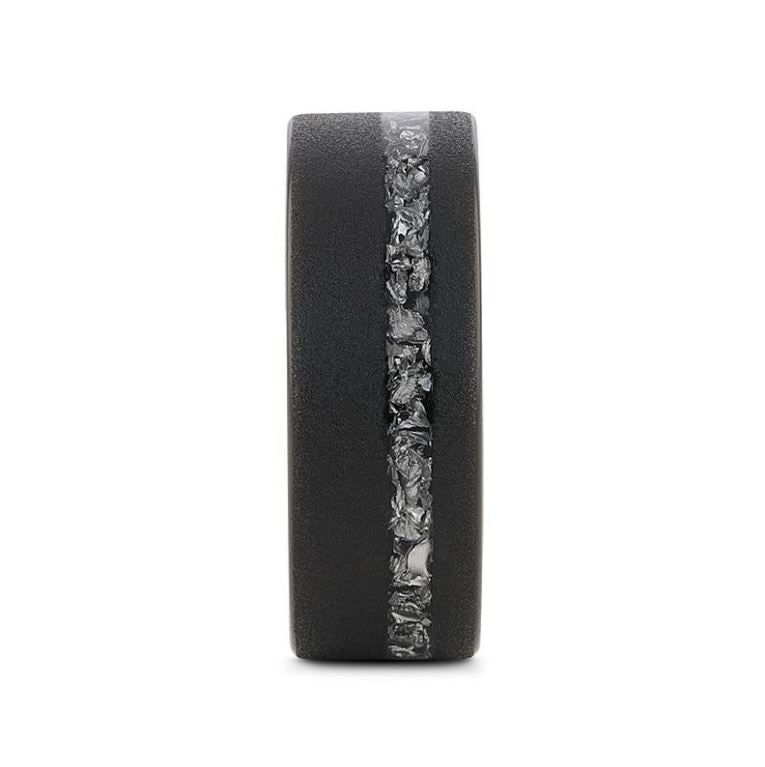 Heralding our ABYSS Sandblasted Black Tungsten Ring featuring meteorite fragments, blending durability with cosmic allure. Sleek 8mm design for a stellar look.