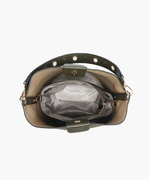 - Classic bucket silhouette with secure snap closures