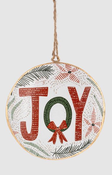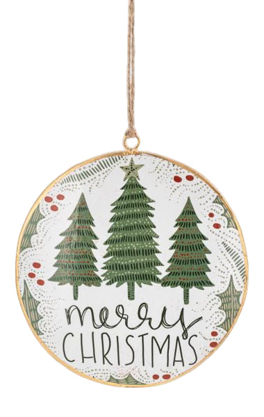 Each round metal ornament features a classic holiday design with cheerful, hand-painted style artwork and jute hanging twine.