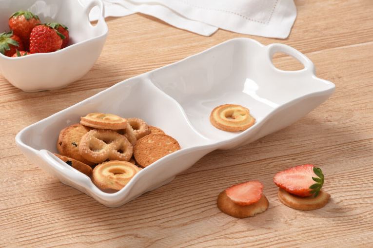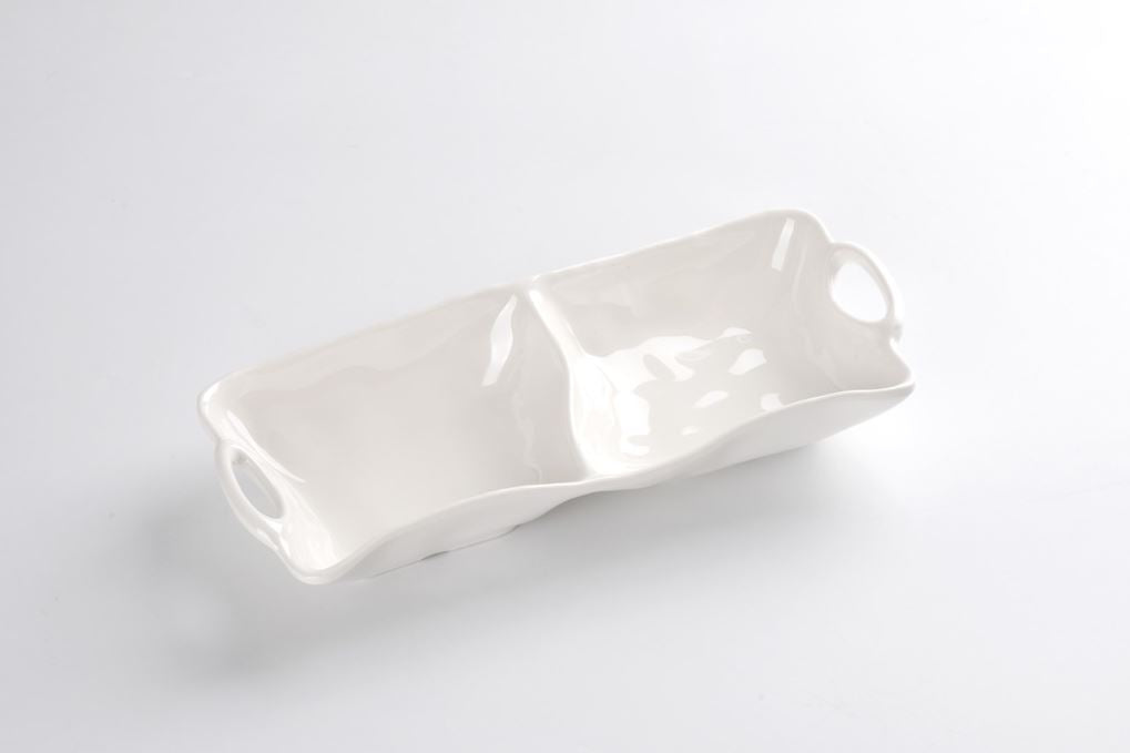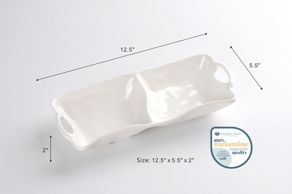 2 Section Server in our Ivy Collection. Great for serving your favorite pairs! Think chips and dip, hummus and veggies or apples and peanut butter. Sleek white-toned superior quality melamine. Great for your indoor and outdoor activities. Food safe, freezer safe, dishwasher safe, Easy Care.