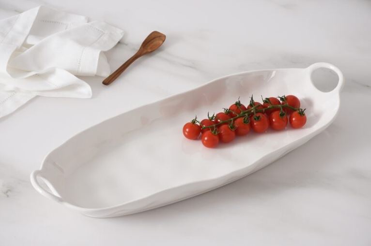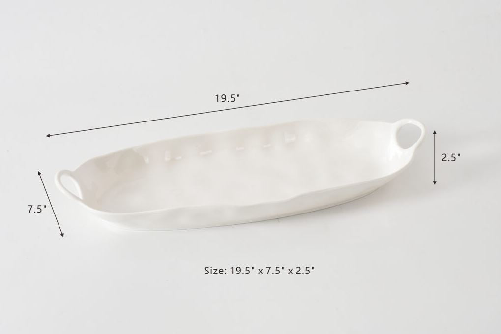 Deep Long Server from our Ivy Collection. This platter is great for serving an assortment of freshly sliced breads or a variety of appetizers from stuffed mushrooms to baby lamb chops to yakitori. Asparagus, carrots, green beans, even a whole fish all are stunning on this piece. Sleek white-toned superior quality melamine. Great for your indoor and outdoor activities. Food safe, freezer safe, dishwasher safe. Easy Care.