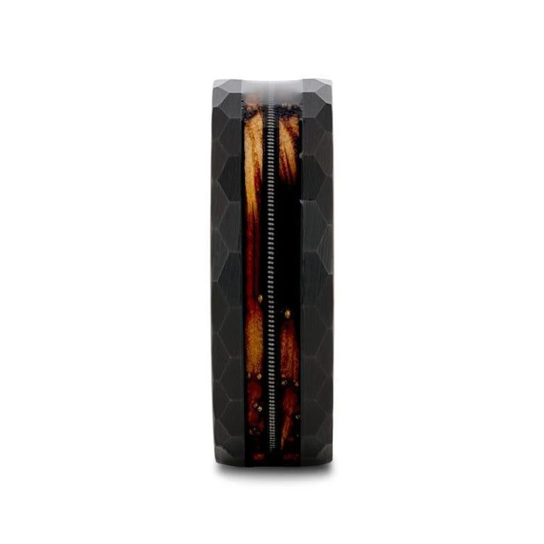 RIFF Black Tungsten Ring, features a unique blend of a charred whiskey barrel and guitar string for a edgy look. Superior craftsmanship and timeless elegance. Made from whiskey barrels once used by Jack Daniel's Distillery.